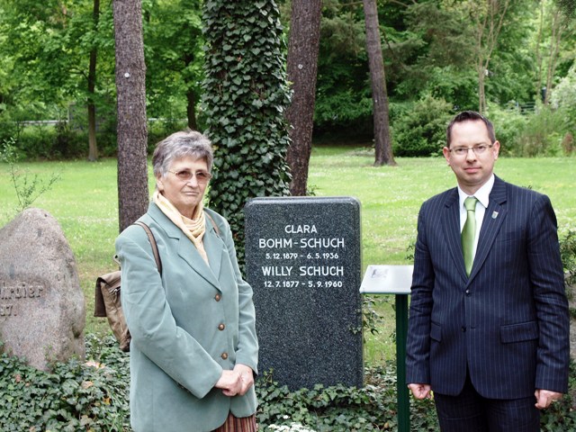 Mit der Enkelin von Clara Bohm-Schuch, Annette Düster, an Grab und Informationstafel (Foto: Stefan Förster)